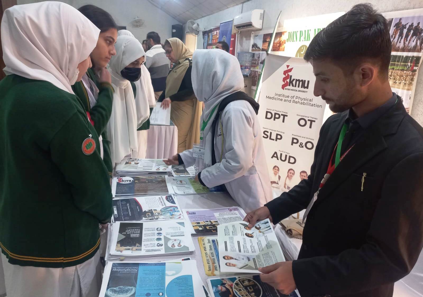 KMU team comprising of Mr. Sahir Atiq, Additional Director Academics and Students ambassadors from 2 institutes visited Army Public School for International Studies (APSIS) Peshawar on their request. Purpose of the event was to provide their students with insights into undergraduate admission processes at leading Universities and offer the guidance and information they need to navigate their higher education journeys. KMU was the only Medical University participated in the event. The students of Army Public School were impressed by KMU's reputation and academic standards. The officials of Army Public School appreciated KMU’s participation in the event and looked forward for further collaboration in various fields.